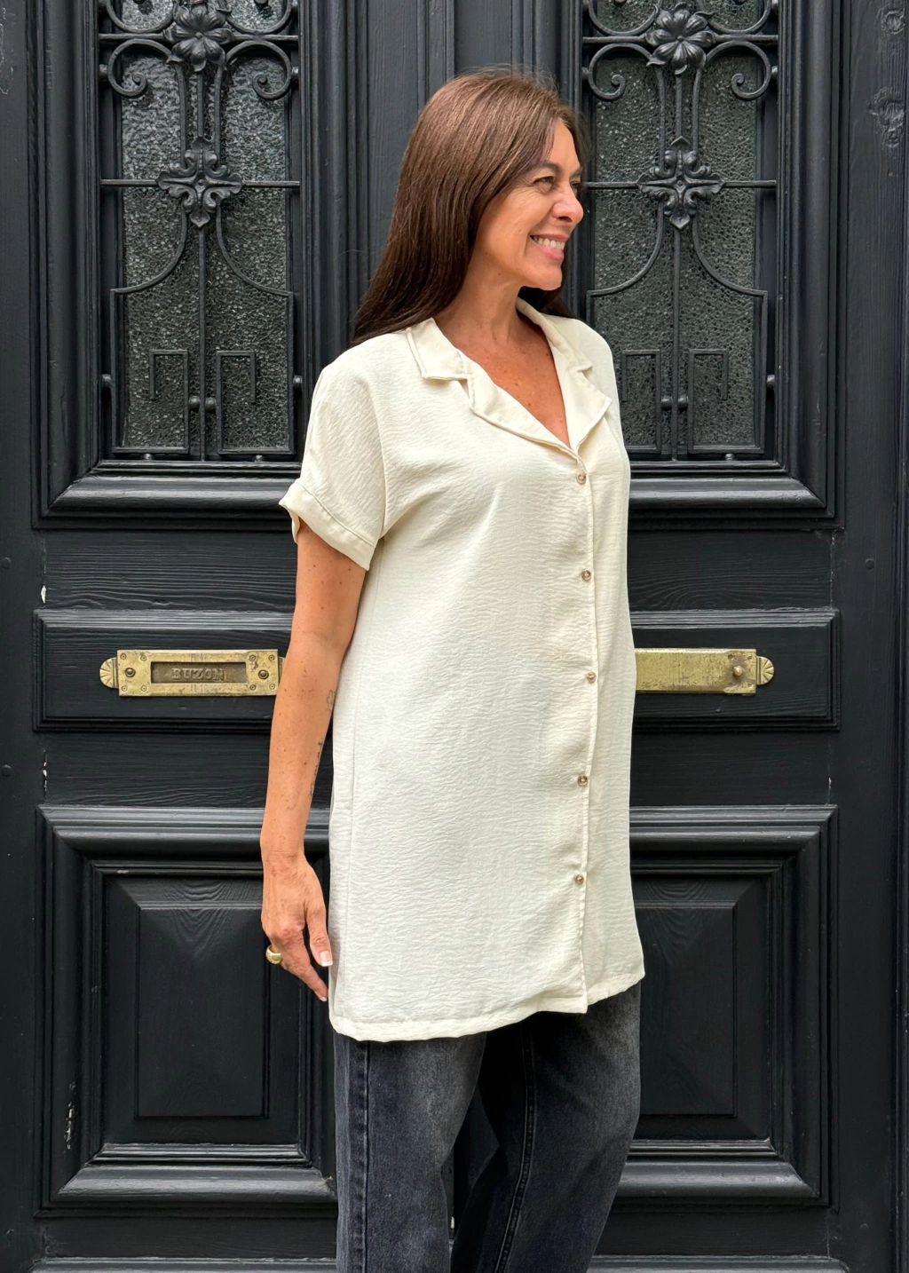 ✔ Diseño: Silueta oversize larga con mangas cortas.